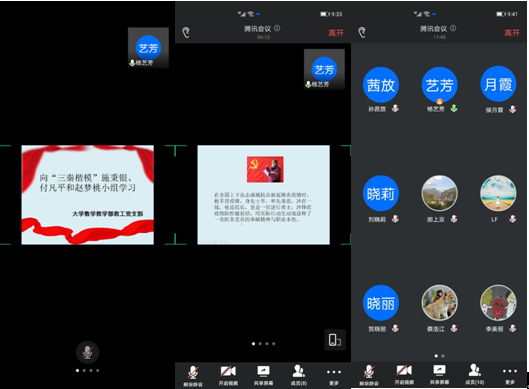 2020年6月29日,大学数学教学部教工党支部通过腾讯会议在线学习了“三秦楷模”施秉银、付凡平和赵梦桃小组的先进事迹。会议由杨艺芳主持,支部全体成员参与了本次会议。