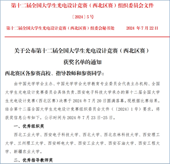 第十二届全国老员工光电设计竞赛(西北赛区)获奖名单