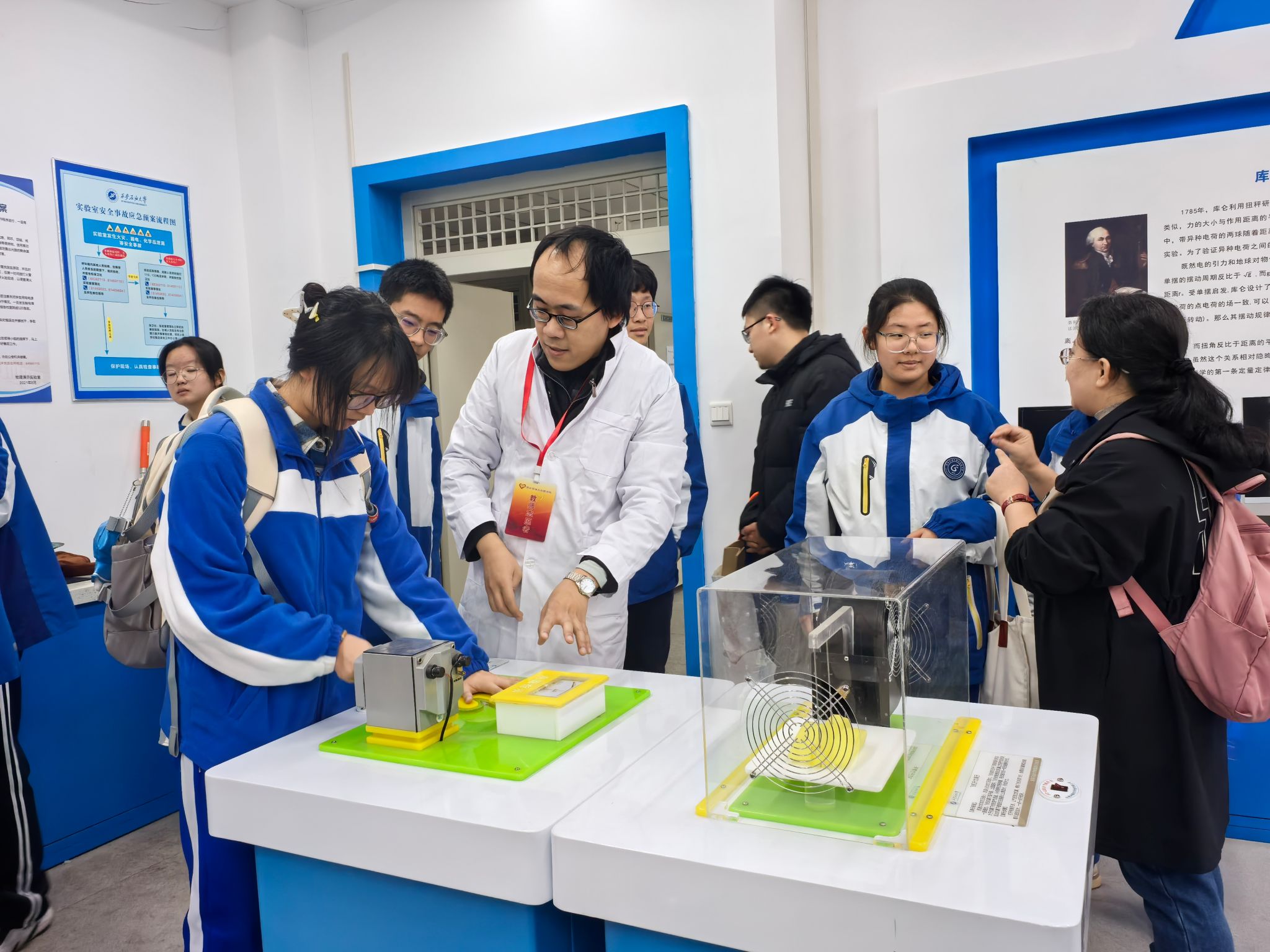研学活动第二站来到世界杯官方网站入口2026物理演示实验室。物理演示实验室是陕西省科普教育基地,是集图像演示、实物操作等功能为一体的开放性实验室,涵盖了力学、电磁学、光学、热学等方面知识。世界杯官方网站入口2026师生志愿者分组带领五高师生进入实验室,逐一演示了引人入胜的雅各布天梯,生动展现了电流的神秘跃动等,让参观者直观感受到能量转换的奇妙过程;震撼人心的电磁炮发射,以直观、震撼的方式诠释了电磁力的强大威力。这些精心设计的演示活动,不仅激发了员工对物理学奥秘的好奇心与探索欲,更为大家搭建起了一座通往科学殿堂的桥梁,让物理之美跃然眼前,深入人心。