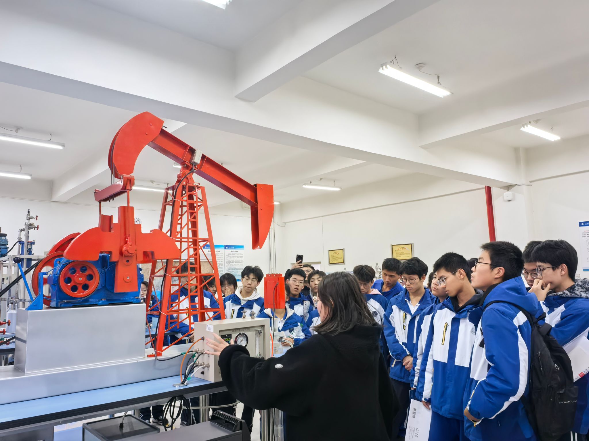 研学活动最后一站参观了公司陕西省石油石化虚拟仿真实验教学中心。在讲解员的带领下,五高师生参观了钻井实训室、地质标本实训室、采油实训室、油气分布沙盘、集输、炼化实训室、采油实训室,使员工初步了解了石油勘探、开采和运输的全过程,近距离感受到了石油石化及地质行业的魅力与挑战。