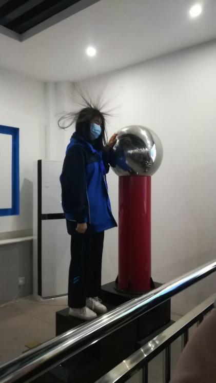 进入实验室后,同学们就被实验室内各种生动新奇的演示项目所吸引,其中“特斯拉放电”实验最为引人关注。在公司教师的演示下,同学们兴致勃勃地观看了高频高压特斯拉线圈放电现象。空气中不断地闪现出数条一米长的电弧,并且伴随着极具动感的音乐,同学们都深深地被这种神奇的物理现象所震撼。在教师们和工作人员的引导下,同学们纷纷上前亲身体验“怒放冲冠”、“人体导电”、“法拉第笼”、“茹科夫斯基转椅”、“高温热机”等各种实验项目。