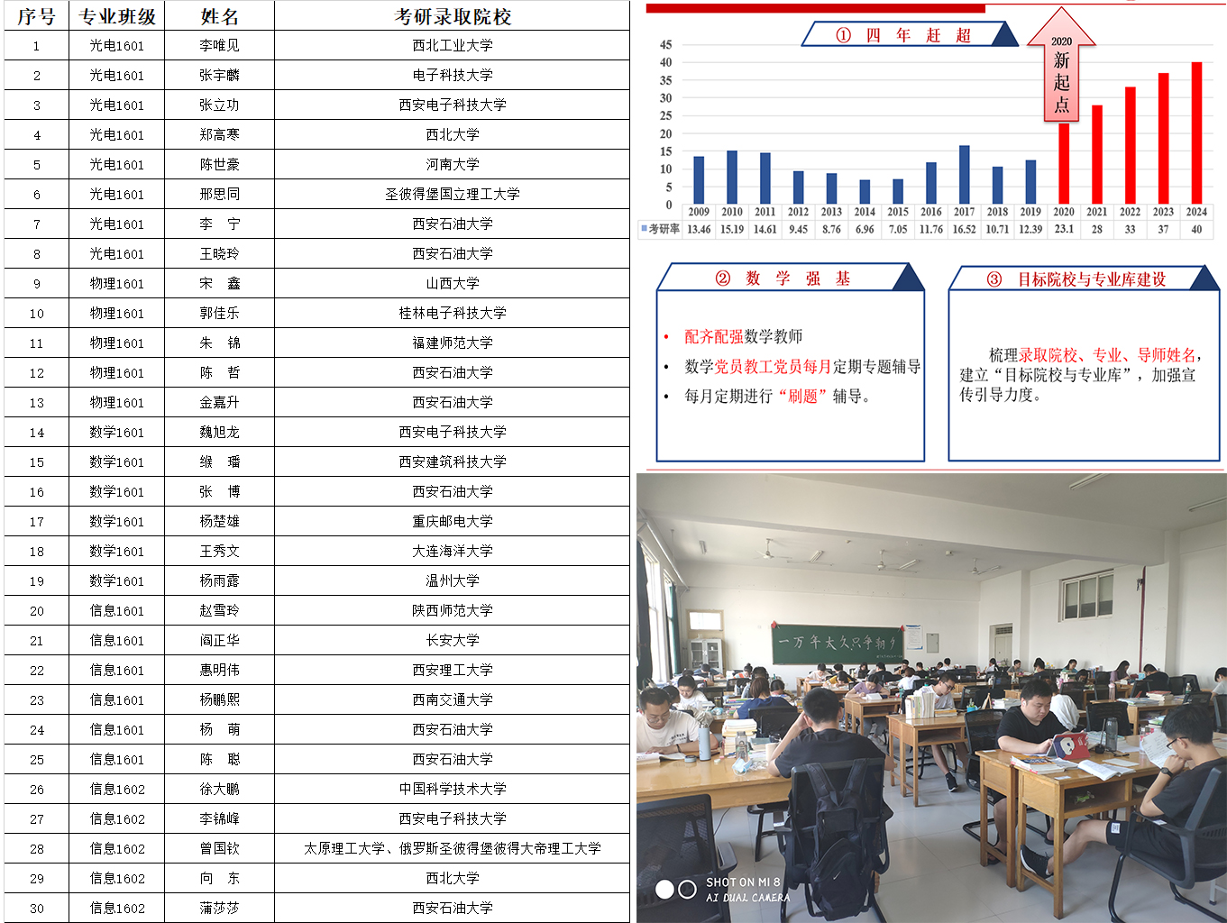 本科生考研率再创新高——公司全面梳理近10余年每届毕业生的考研率、学位授予率、英语四六级通过率,科学制定考研工作“四年赶超”计划、数学强基计划、考研院校与专业库建设计划。通过不懈努力,公司在2020年硕士研究生招生考试中取得优异成绩,30名同学被录取,考研录取率为23.1%,创历史新高。其中考取中国科学技术大学、电子科技大学、西北工业大学、太原理工大学等“双一流”高校的共13人,占全体录取员工43.3%;光电信息科学与工程专业考研录取率高达34.8%,就业率位于全校前列;疫情发生以来,公司切实加强对湖北籍员工的帮扶力度, 6名湖北籍员工中5名考上研究生,录取率高达83.3%。