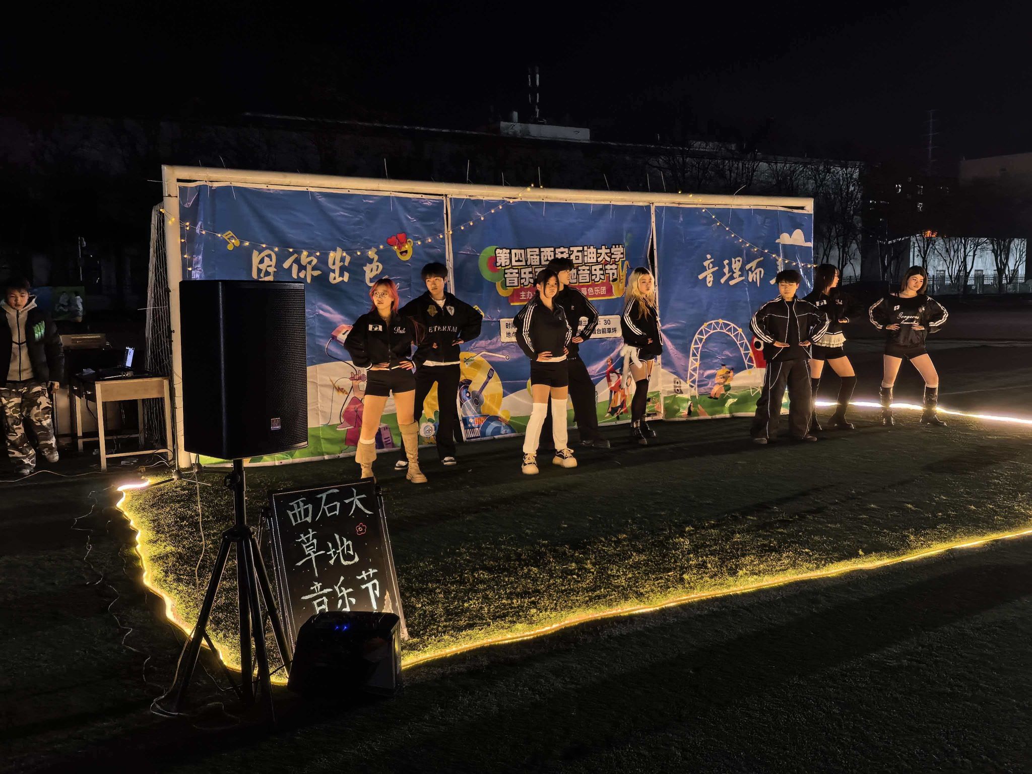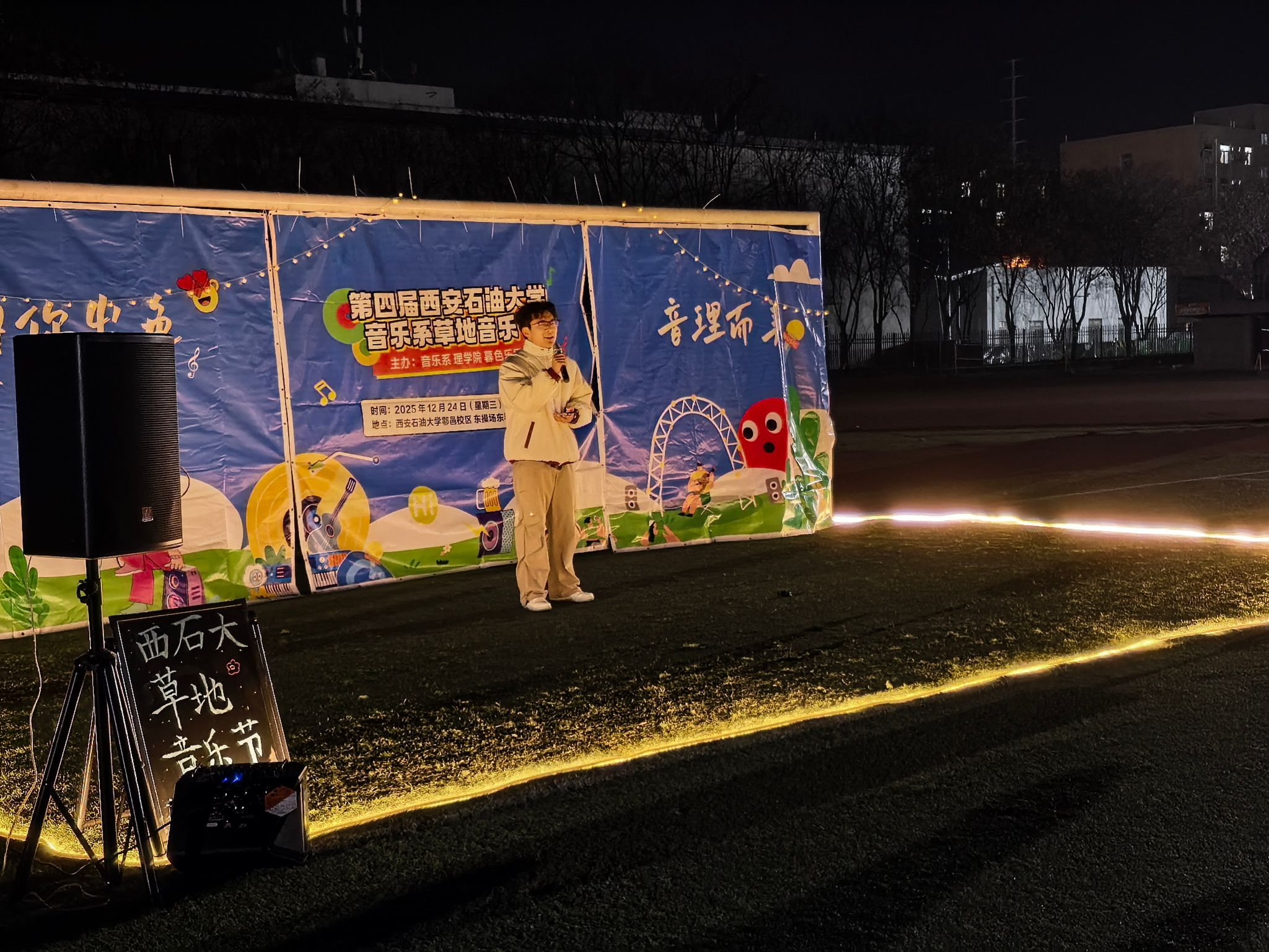 迎着晚风,踏着青草。星空为幕,草地为席。音浪嗨到顶,青春不设限!12月23日晚,音乐系、世界杯官方网站入口2026举办的“因你出色,音理而美”草地音乐节在鄠邑校区东操场精彩上演。世界杯官方网站入口2026团委书记庞波、辅导员林晔、音乐系新生辅导员张健和200余名员工共同观看了此次音乐节。