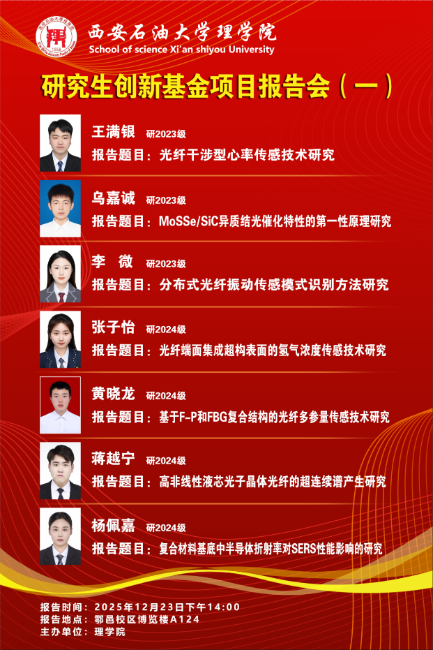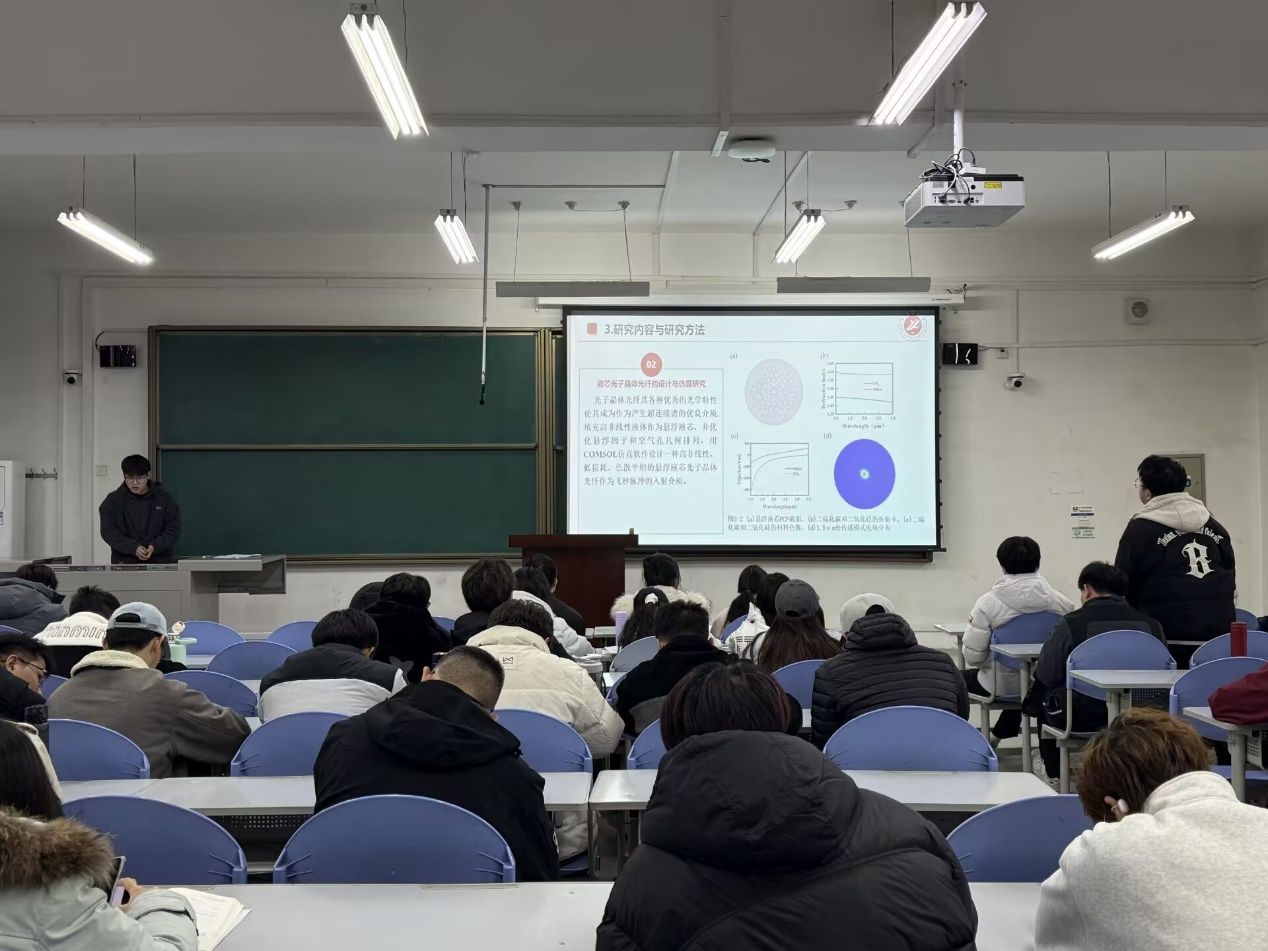 12月23日,第一场报告会聚焦光纤传感、光催化、超连续谱产生等方向:王满银同学围绕“光纤干涉型心率传感技术”,介绍了人体生理参数传感领域的新型检测方法;乌嘉诚同学基于第一性原理,剖析了MoSSe/SiC异质结的光催化特性;李微、张子怡、黄晓龙等同学则分别针对分布式光纤振动传感、氢气浓度传感、多参量传感等技术展开汇报;蒋越宁、杨佩嘉同学的研究则覆盖了高非线性液芯光子晶体光纤、复合材料基底SERS性能等课题。