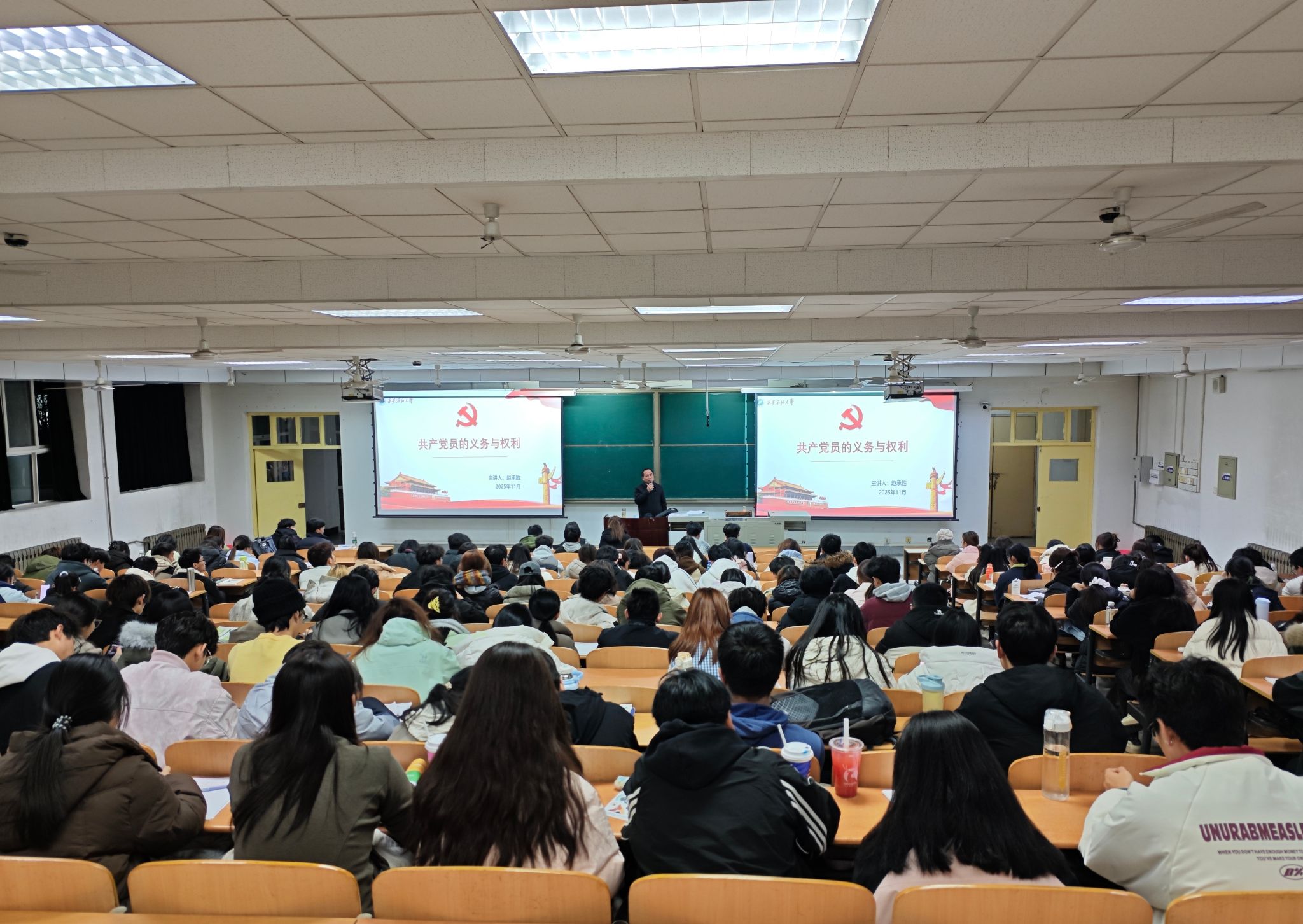 赵承胜以“党员的义务和权利”为切入点,详细讲解了中国共产党员的“八项义务”和“八项权利”的具体内容,并对义务和权利二者间的辩证关系进行了详细阐释。他谈到,党员的权利和义务是有机统一的,是互为条件、相辅相成的,应正确理解和处理好权利和义务的关系,党员不仅享有党章规定的权利,更需要时刻履行党员的义务,严格要求自己,积极发挥先锋模范作用。课堂上,赵承胜深入浅出,他号召同学们严格遵守党的纪律,执行党的决定,服从党的安排,在生活和学习中发挥先锋模范作用,以党员的标准磨砺自身品格,不断提升自己,早日加入中国共产党,为国家、社会发展贡献青春力量。