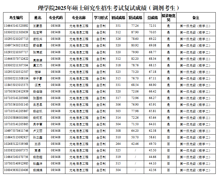 世界杯官方网站入口20262025年硕士研究生招生复试成绩公布(光电信息工程调剂考生)(第一批)