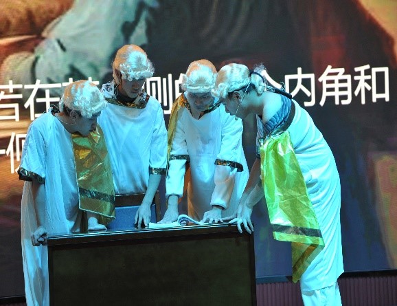 参加展演的16个节目分为课程实践作品与文艺节目两大类,来自10个院系的一百五十多位同学在舞台上展示了他们探究数学启蒙思想、对实际生活中建模的理解、对数学之美的发现。其中有根据数学家故事绘制的“数学漫画”、有结合数学原理制作的“古代建桥黑科技之超强承重筷子桥”、有用Python编写的函数动画;舞台剧《几何原本》漫溯历史长河、探索数学真谛,《王冠的秘密》《田忌赛马》以夸张幽默的表演再现经典数学故事;小品《数游长安》让数学问题和文化旅游巧妙碰撞;街舞《数学图像秀》尽显青春风采……。